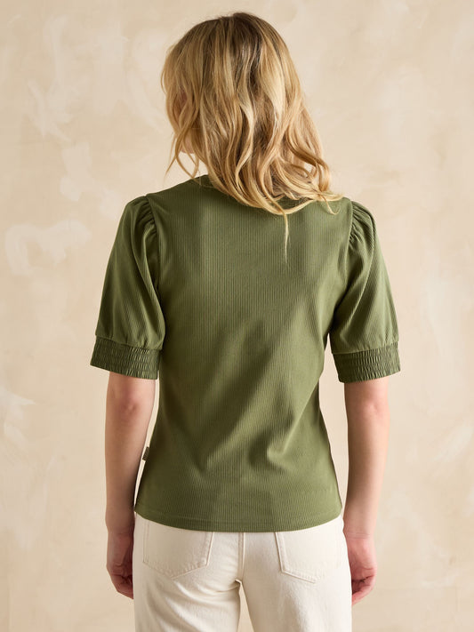 Tabitha Khaki Green Ribbed V-Neck Top With Puff Sleeves