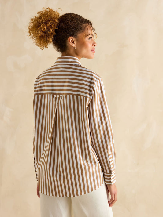 Amilla Tan & White Stripe Longline Relaxed Fit Shirt