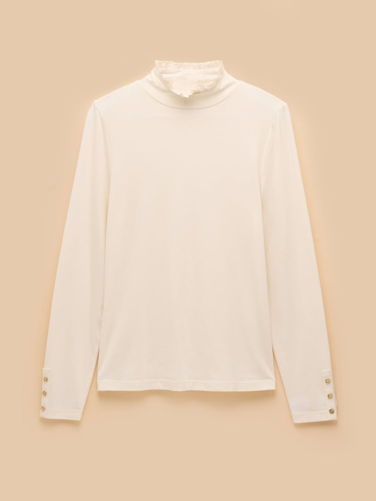 Crafted from cotton that includes a little stretch for a lot of comfort, this top will be the perfect starting point for a lot of outfits. With its ribbed texture, high-neck frill collar and button detail to the cuffs, it can sit effortlessly under dresses and shirts for an elegant yet understated look.