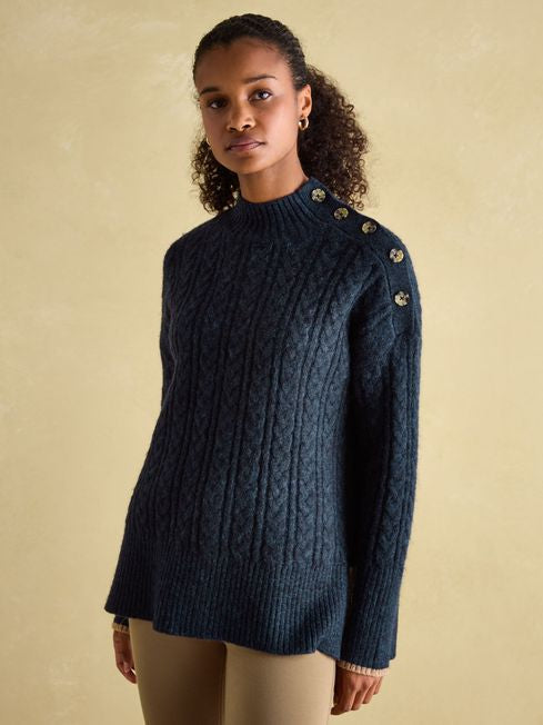 If you're a fan of knitwear, then this new style in navy may be of interest. Crafted from a soft wool blend, with a funnel neck, button detail to one shoulder, cable knit to the body and sleeves, and deep ribbing to the cuffs and hem, it really is a classic in the making. Sumptuously cosy and oh-so comfortable it will make those autumn and winter months worth it. This is a stand-out style that will give your friends wardrobe envy.