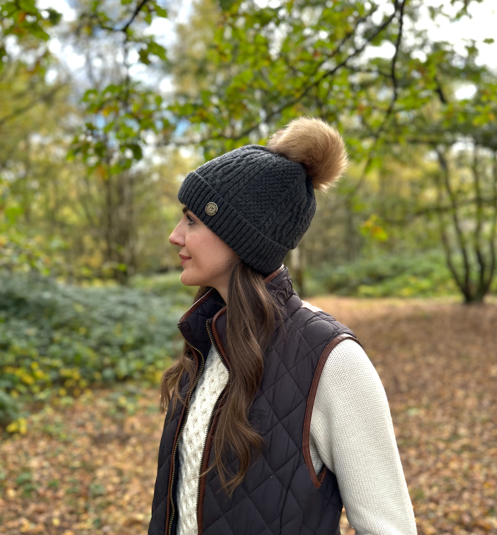 - The perfect cosy winter bobble hat: knitted with a luxurious cashmere, wool, cotton and viscose blended yarn, its elegant, snug and warm. Fully lined with a super soft teddy fleece, the knitted rib ensures a perfect fit, and we've made this one deep enough to keep you ears covered too. The exterior is combination of cable and moss knits, topped off with a generous, ultra realistic faux fur pom. Pop on this cosy hat for winter walks, ski trips, playground drop off's and rugby matches - or simply hide a bad hair day! We're sure you'll love it and won't want to take it off other than to wash it! On that we suggest you hand wash the hat (dry it flat and reshape whilst damp), try not to submerse the pom, but if it does get wet then you'll need to fluff it back up with an old toothbrush!