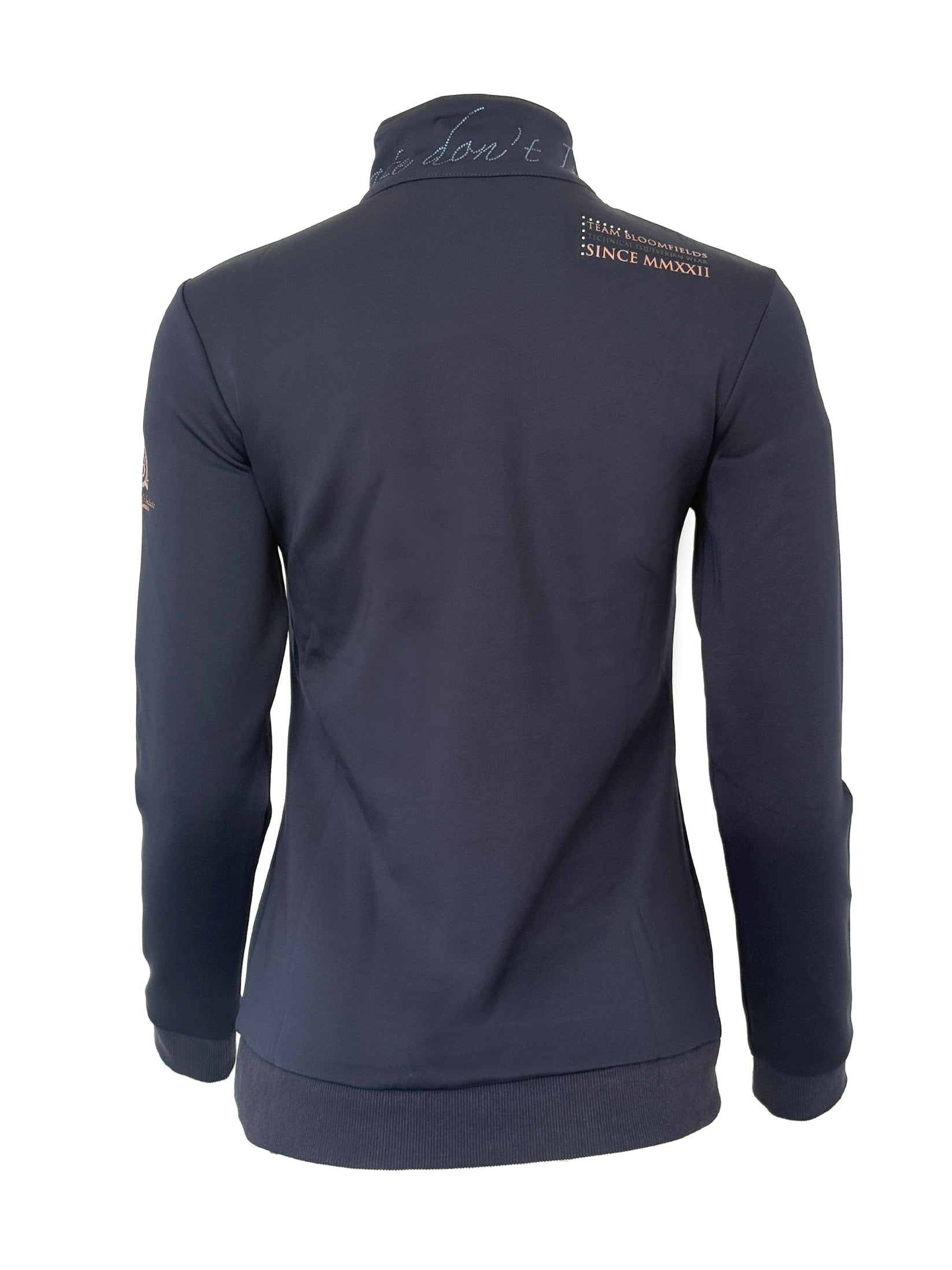 Finished in navy with rose gold details including quarter zip and exquisite high neck design with Innovate don't Imitate in blue rhinestone's around the neck