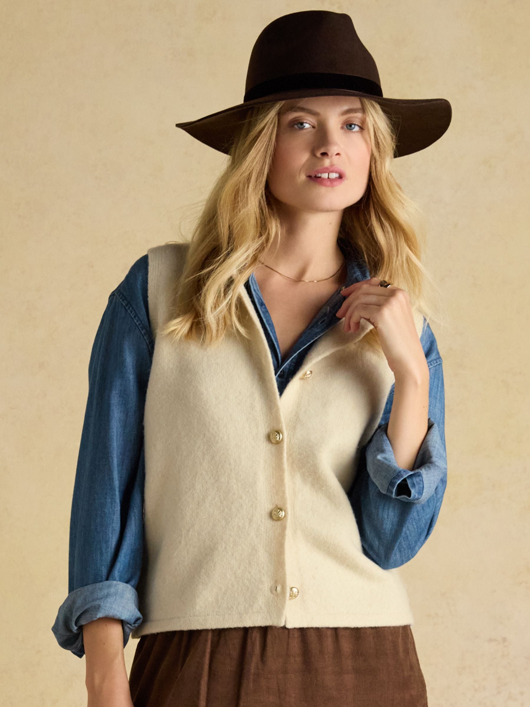 This is our Holly Cream knitted vest, refreshed for a new season. It has the same luxuriously soft knit fabric and flattering straight fit through the body, but has been elevated through five metal shank buttons to the front.