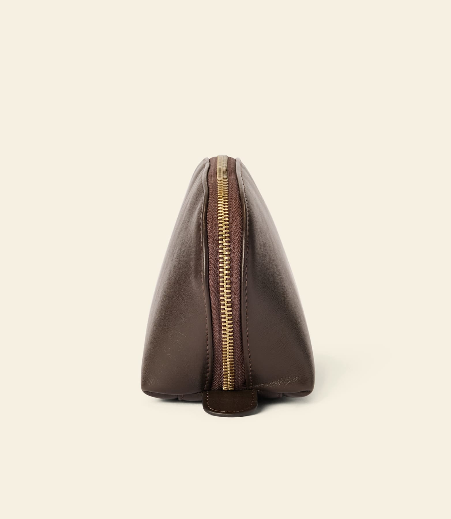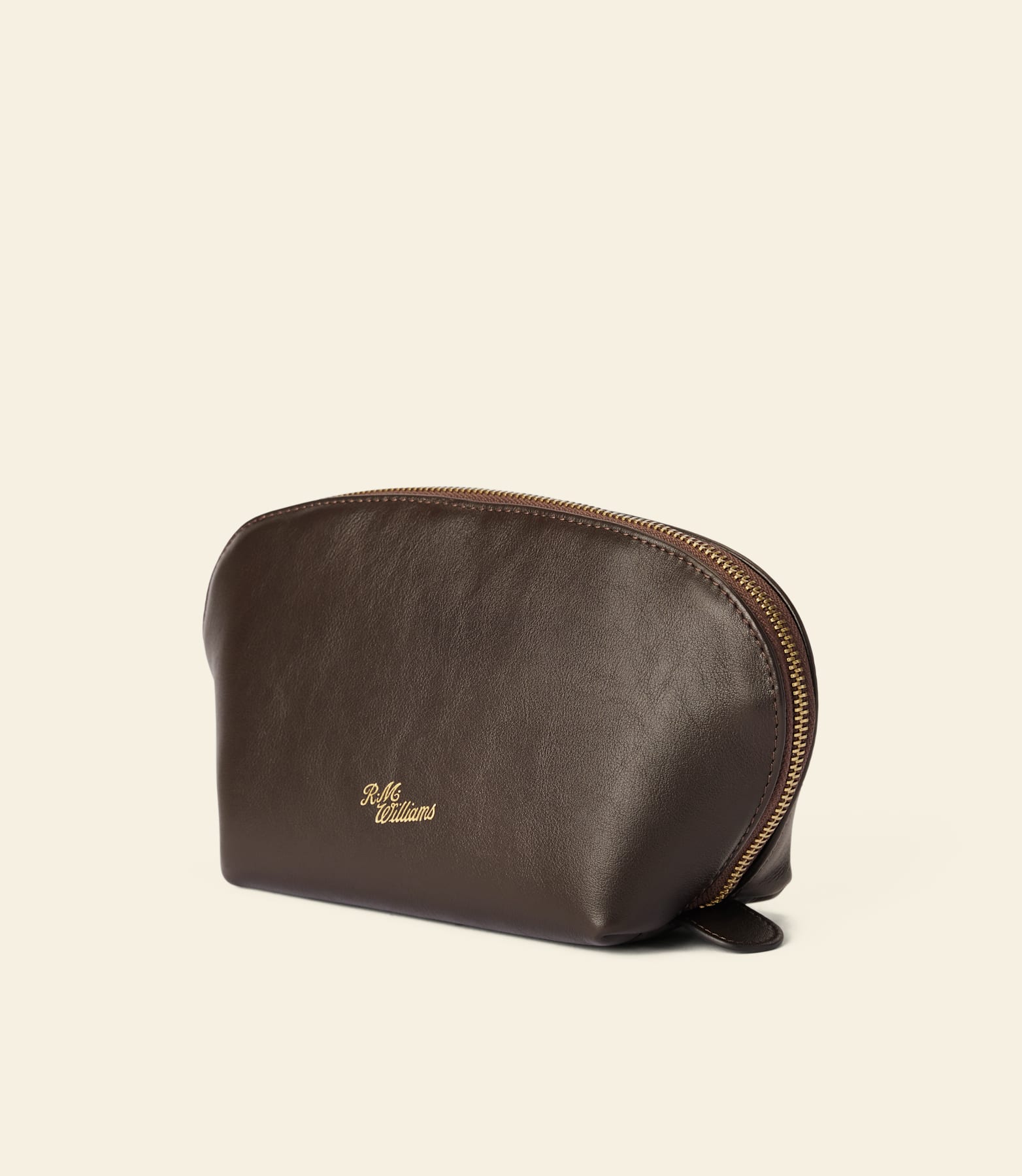 This elegant cosmetic case, crafted from full-grain nappa leather, features a recycled nylon lining, antique brass zip closure, three internal slip pockets, and a debossed R.M.Williams script foil logo.