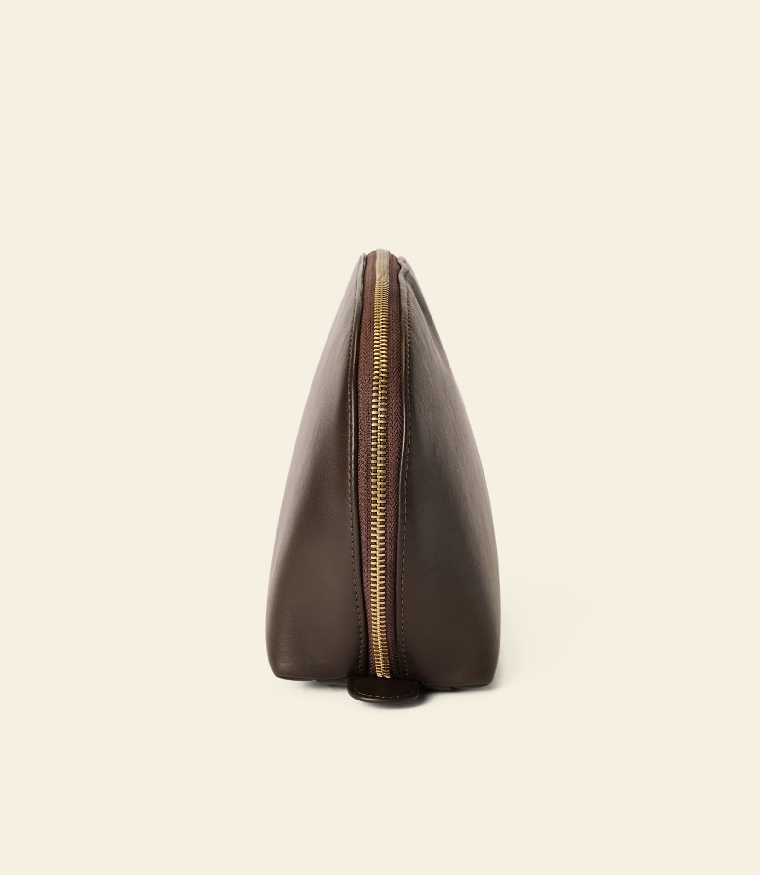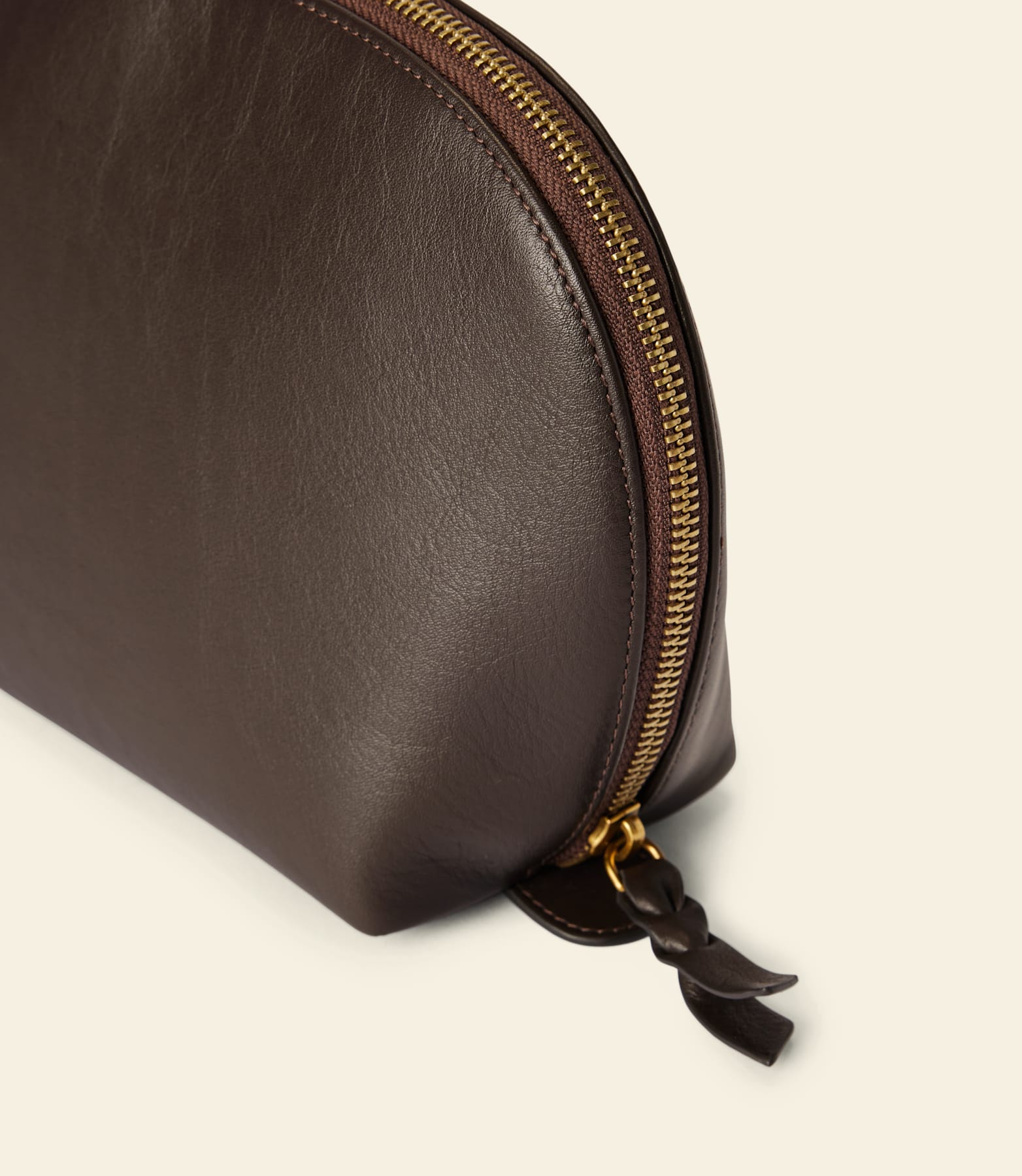 This elegant cosmetic case, crafted from full-grain nappa leather, features a recycled nylon lining, antique brass zip closure, three internal slip pockets, and a debossed R.M.Williams script foil logo.