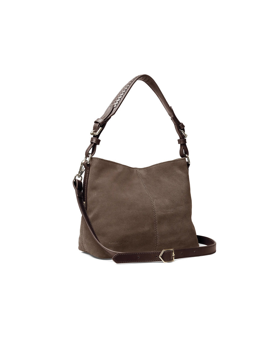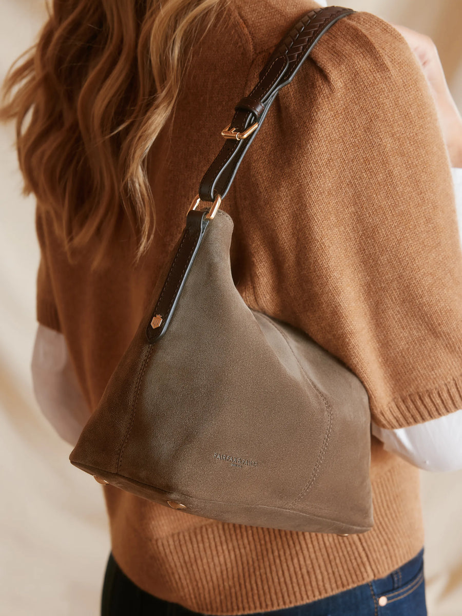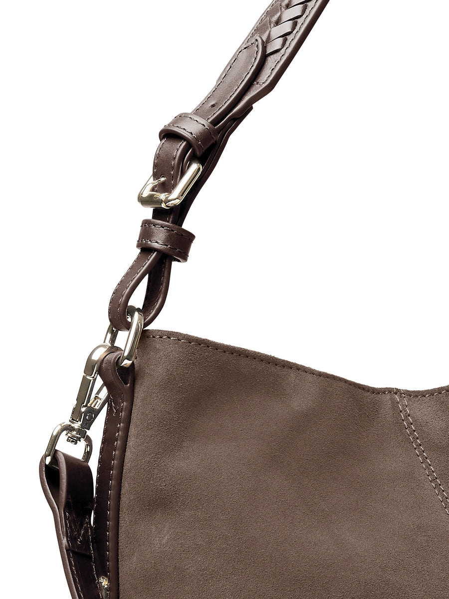 Handcrafted in soft, sustainable suede with luxurious leather touches, like the braided over-shoulder handle and detachable crossbody strap, understated branding detail includes shiny light gold shield hardware and an embossed logo. The microfibre-lined large compartment, magnetic clasp fastening, internal zipped compartment and pocket, and a gold studded base complete the detail.