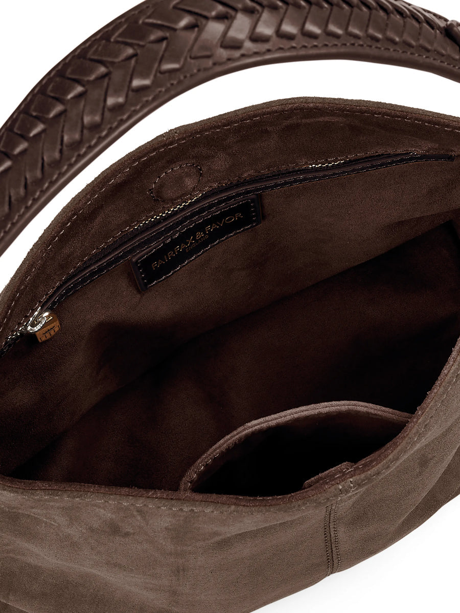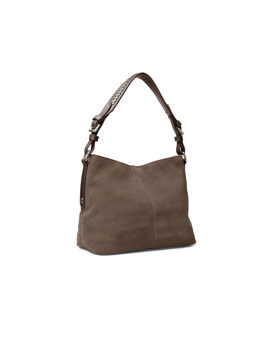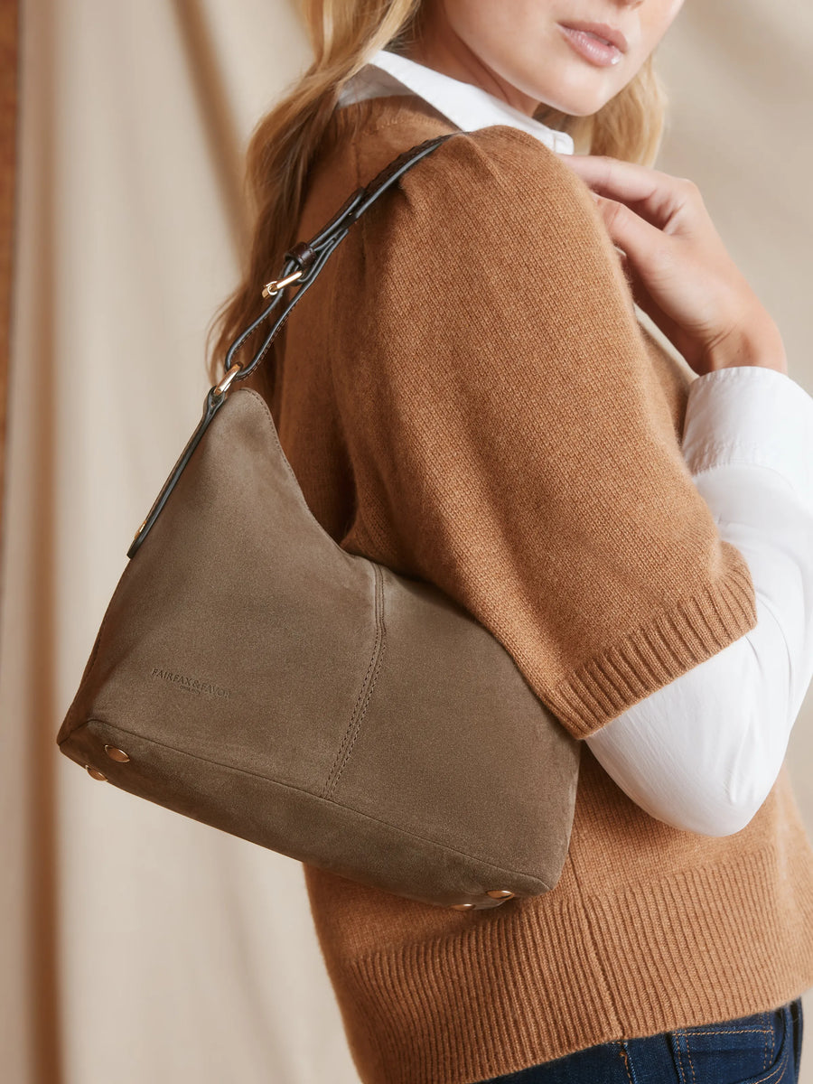 Handcrafted in soft, sustainable suede with luxurious leather touches, like the braided over-shoulder handle and detachable crossbody strap, understated branding detail includes shiny light gold shield hardware and an embossed logo. The microfibre-lined large compartment, magnetic clasp fastening, internal zipped compartment and pocket, and a gold studded base complete the detail.