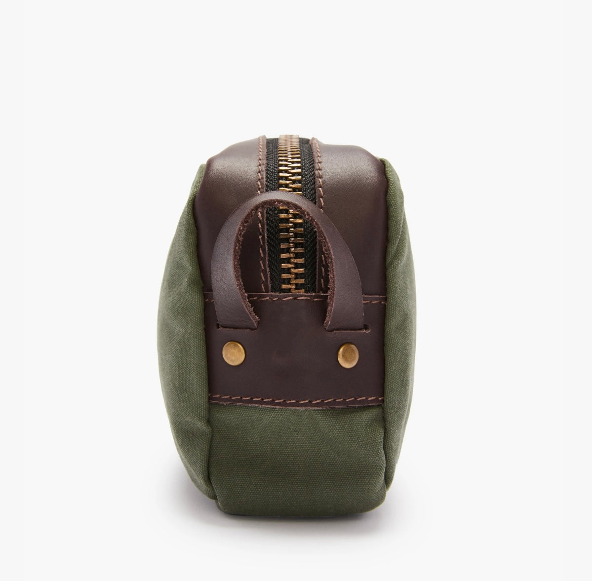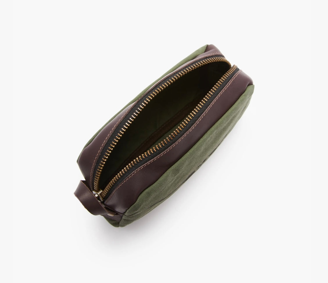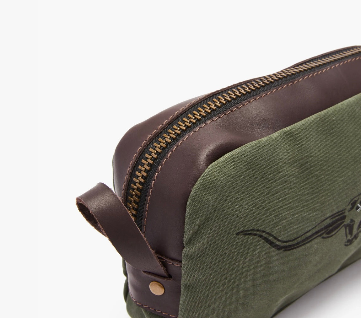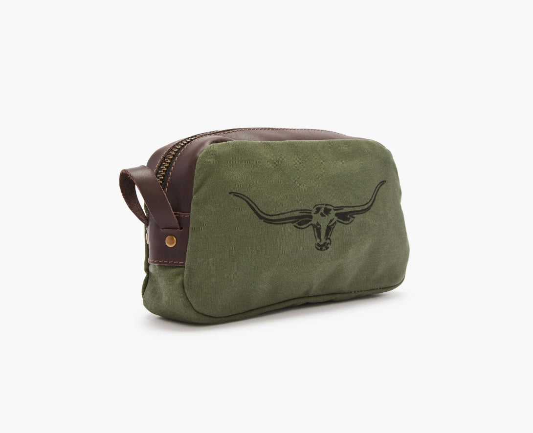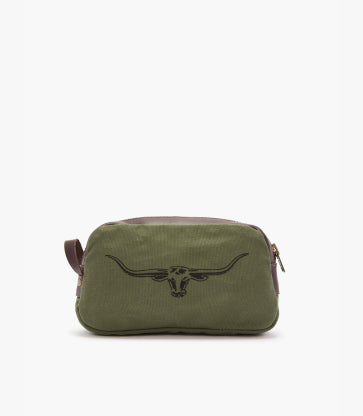 The Ute Washbag is a conveniently sized canvas washbag, ideal for travel, featuring a carry handle, leather trim, zip closure and Longhorn print.