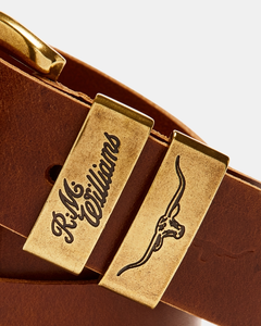 Crafted in Australia, the iconic Drover belt is made from durable double butt vegetable-tanned leather with debossed Longhorn logo on tip, finished with an engraved antique brass buckle and keeper set.