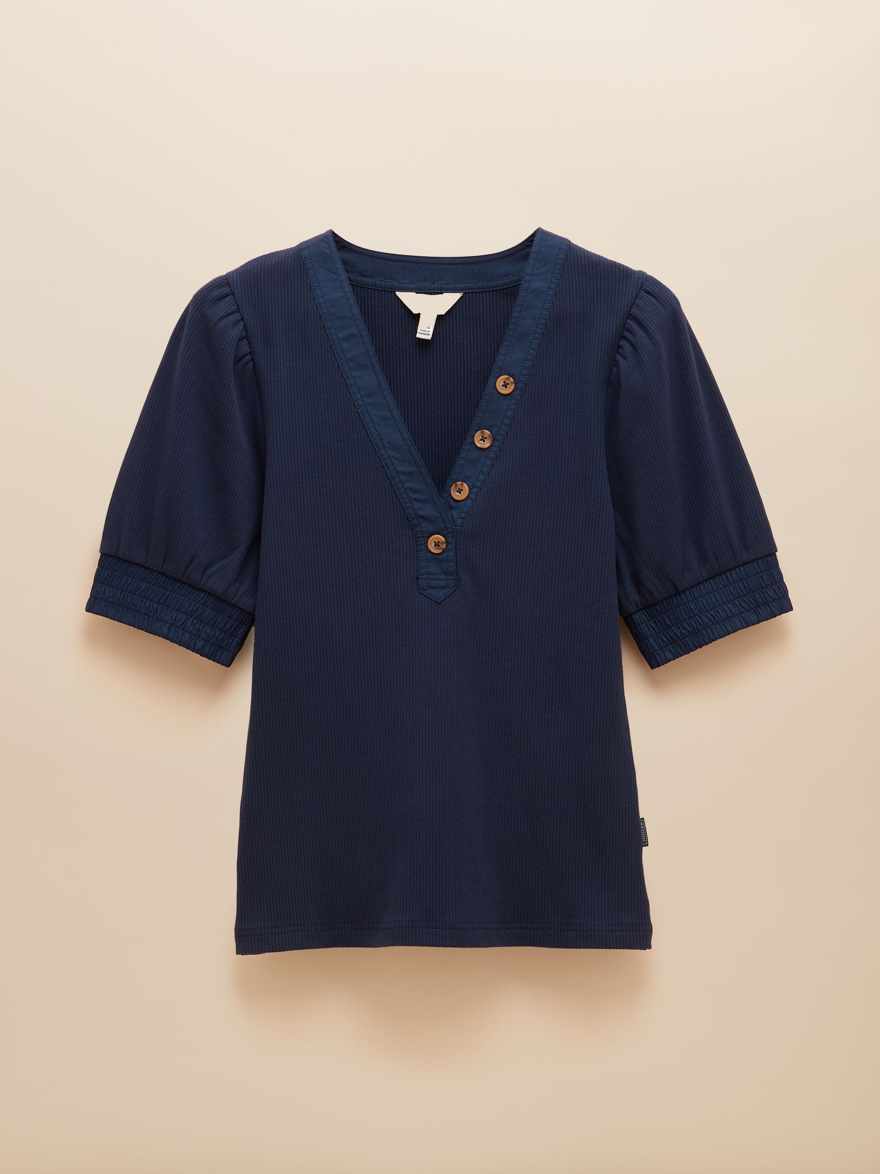 The Tabitha is an everyday style, elevated. It's made from a cotton blend, and the fabric is ribbed, adding stretch through the body and sleeves. The short puff sleeves and a V-Neck with non-functional button detail add a feminine touch. Elasticated ribbed cuffs finish it off and ensure a comfortable fit.